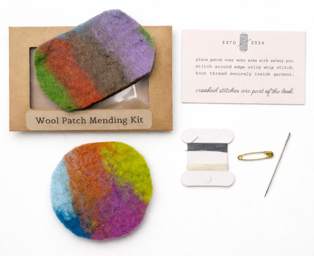 Wool Patch Mending KitA beginner-friendly kit that makes visible mending simple and approachable. Perfect for repairing clothing while adding character and extending the life of garments.Includes: